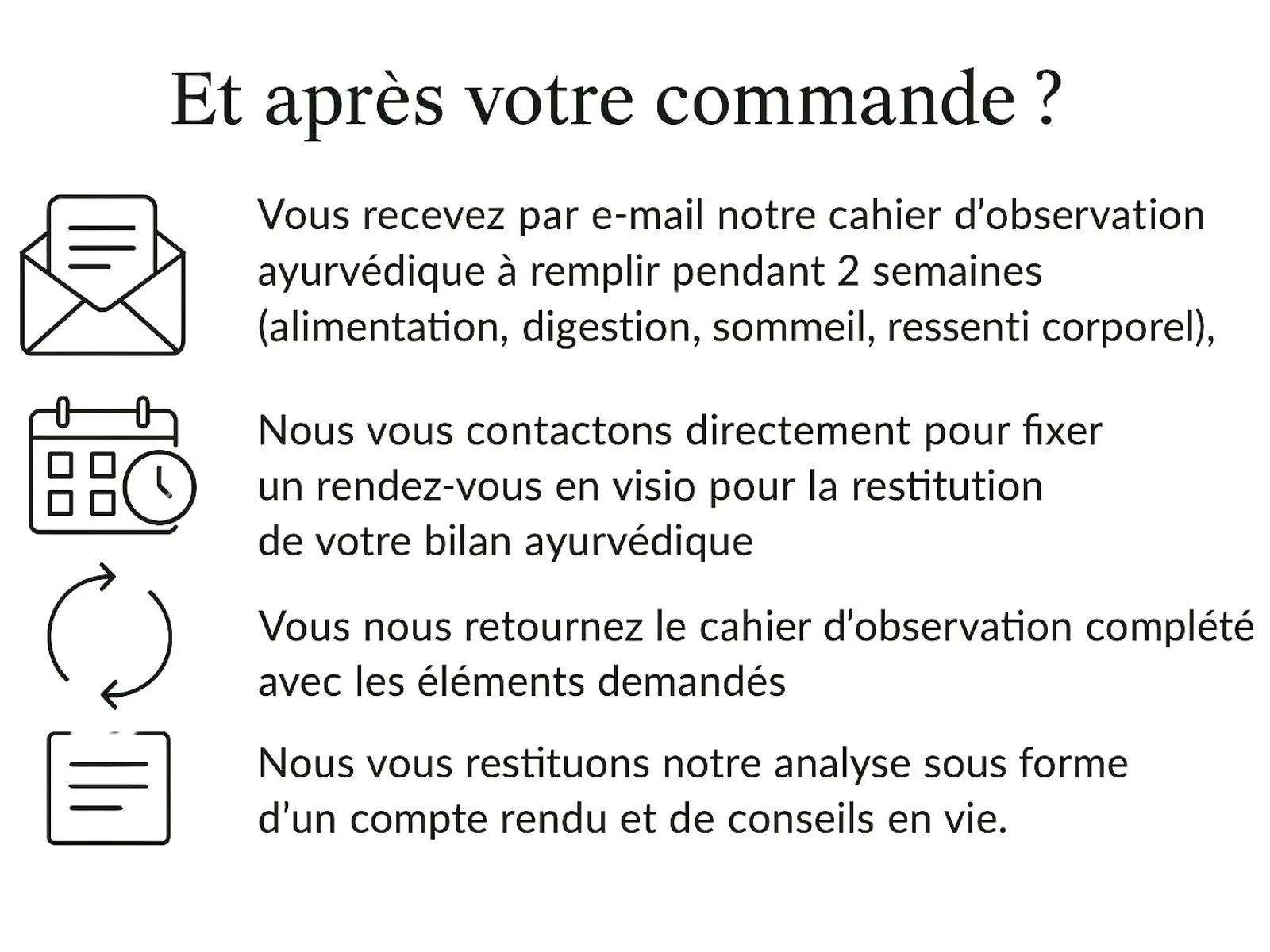 Vous recevez immédiatement votre cahier d'observation ayurvédique et nous vous contactons sous 48h ouvrés pour fixer un rendez-vous de restitution en visio conférence.
