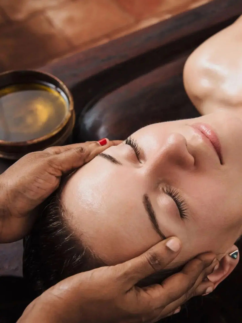 Un filet d’huile chaude (généralement de l’huile de sésame médicamenteuse) coule en continu sur le front. C’est LE soin phare pour calmer le mental, apaiser Vata, traiter l’insomnie, l’anxiété, l’hyperactivité mentale.